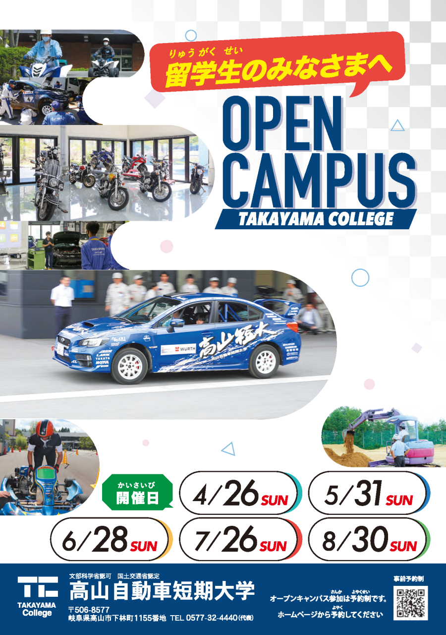 高山自動車短期大学は、4月から8月まで、オープンキャンパスを行ないます。このオープンキャンパスには、留学生のみなさんも参加することができます。