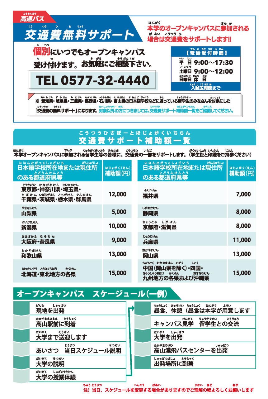 ※わからないことは、電話(でんわ)で確認(かくにん)してください。電話(でんわ)の相手(あいて)に、「オープンキャンパスについて聞(き)きたいのですが」と、伝(つた)えてください。 |