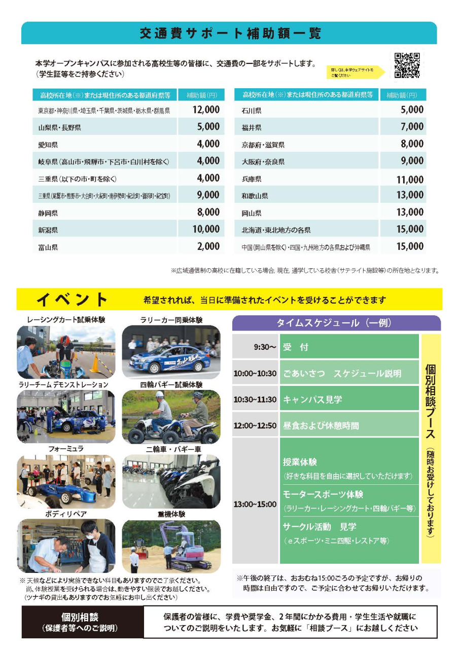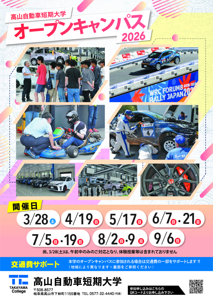 | 開催場所 | 高山自動車短期大学 キャンパス内 (参加受付・集合場所は、お申し込み後、メールにてお伝えします。) |